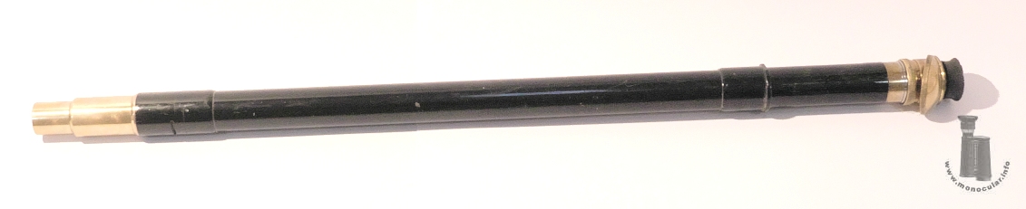 | Der schwarz lackierte Haupttubus ist 935mm, der messinge Objektivtubus 130mm und das Okularstück 75mm lang. Der Tubus ist 52mm, die dickeren Teile 56mm (Objekitseite) und 57mm (Okularseite) im Durchmesser, der Objektivtubus ist zunächst 50mm und dann 47mm im Durchmesser. Das Okularstück misst 52mm, der Fokussierungsring 60mm, der Filterring 76mm, die Beschriftungsscheibe 65mm und die Augenmuschel 57mm im Durchmesser. Das Schrtenfernrohr wiegt 4475 g. | The black lacquered main tube is 935mm long, the brass objective tube is 130mm and the eyepiece is 75mm long. The tube is 52mm, the thicker parts 56mm (objective side) and 57mm (eyepiece side) in diameter, the objective tube is first 50mm and then 47mm in diameter. The eyepiece measures 52mm in diameter, the focusing ring 60mm, the filter ring 76mm, the inscription disc 65mm and the eyecup 57mm in diameter. The embrasure telescope weighs 4475 g. |