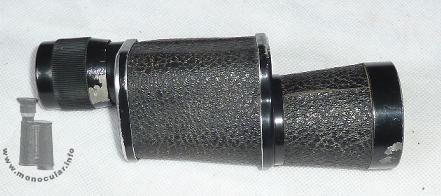 | Das Denhill 10x35 Monokular ist mit "Made in France" am unteren Deckelrand sowie dem acht strahligen Sonnenzeichen mit "F" für französische (Qualitäts)Marken beschriftet. Es entspricht dem Auqilus 10x35. So sind auch hier die Deckel schwarz lackiert, der untere einfach, der obere zweifach verschraubt. Auch das Mekrmal "COATED" ist zu finden und belegt, dass es ein Nachkriegsprodukt sein muss. Die Augenmuschel mit dem Fokussierungsring am linksseitigen Okular ist aus Plastik, die Dioptrienskala läuft rundherum iund ist mit +5 und -5 markiert. Das Gehäuse hat einen Trageriemenöse. | The Denhill 10x35 monocular is marked "Made in France" at the rim of the lower cover, also having the French (quality) trademark symbol, an eight rays sun with an "F" inscribed at the bottom cover. It is almost idetical to the Auqilus 10x35. Thus, the covers are also lacquered black; the lower cover has one, the top cover two screws. The "COATED" marking denotes a post-war make. The left-hand sided eyepiece has a plastic eyecup and focusing part. The dioptre scale runs completely around the eyepeice and is marked with +5 and -5. The body comes with a strap-lug. |