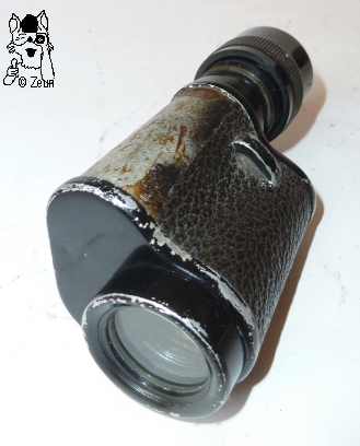| Dieses 6x25 Porro-1-Monokular ist außer mit den Werten nur mit "Deraisme Paris" beschriftet. Die schwarz lackierten Aludeckel haben keine Schrauben. Die Optik ist unvergütet. Der Korpus hat eine eingegossene Trageriemenöse und ist mit strukturiertem Hartgummi überzogen. Die 2/3 Augenmuschel am linkseitigen Okular ist aus Kunststoff. Nach Abschrauben dieser lässt sich das Okularlinsensystem herausnehmen. | This 6x22 porro 1 monouclar is only marked "Deraisme Paris" apart from its specifications. The black lacquered cover plates have no screws. The optics ar uncaoted. The bodyx has a cast-in strap lug, and is covered with a textured ebonite. The 2/3 eyecup on the left-hand sided eyepiece is made of plastic. After usncrewing this you can pull out the ocular lens system easily. |