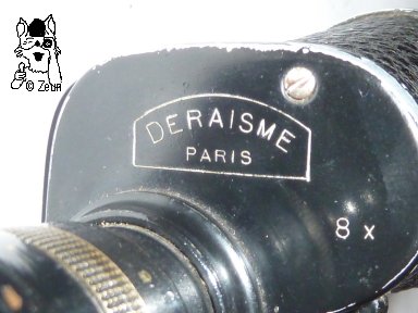 | Das 8x26 Monokular von "Deraisme Paris" ist mit "8x" beschriftet und stammt aus der Zeit von 1905-1925. Die Aludeckel sind einfach verschraubt. Der Korpus ist mit strukturiertem Hartgummi überzogen und die Augenmuschel am linkseitigen Okular ist aus Metall. | The 8x26 monouclar by "Deraisme Paris" is marked with "8x". It dates from about 1905-1925. The aluminium covers have one screw. The body is covered with textured ebonite. The eyecup at the left-hand sided eyepiece is made of metal. |