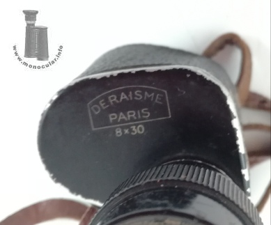 | Das Deraisme 8x30 Monokular ist mit dem Logo und 8x30 auf dem obeen schwarz lackierten Aluminiumdeckel beschriftet. Die Deckel haben keine Schrauben. Der obere Deckel wird jedoch mit einem Schraubring am Okularstück fesgezurrt. Die 2/3 Augenmuschel am rechtsseitigen Okularstück mit einer umlaufenden Dioptrienskala sowie die Objektivfassung sind aus Kunststoff. Das Gehäuse ist mit strukturiertem Kunstleder ummantelt. Am Korpus ist eine Trageriemenöse eingegossen. | The Deraisme 8x30 monouclar is marked with the company logo and 8x30 on the black painted top cover plate. The aluminium covers have no screws, but the top cover is fixed by a retainer ring on the eyepiece. The 2/3 eyecup on the right-hand sided eyepiece and the objective frame are made of plastic. The dioptre scale is running completely around the eyepiece. The housing is covered with a textured hard rubber. There is a cast-in strap-lug. |