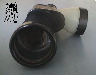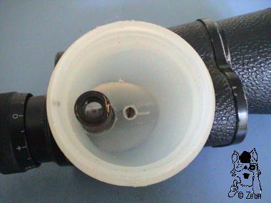 | Das Besondere an dem Monokular ist natürlich der eingebaute Kompass. Dafür wurde das Gehäuse vor dem Okularende aufgebohrt und ein lichtdurchlässiger weißer Plastiktrichter (steht 45mm hervor) eingesetzt. In diesem befindet sich ein kleines Objektivröhrchen, dessen Bild ein Winkelprisma in das Okular umleitet. Am 55mm breiten Ende des Trichters ist ein Flüssigkeits-gelagerter Kompass eingesetzt. Der Trichter ist mit einem schwarzem Kunststoffdeckel verschraubt (Beschriftung: "Pat. App. for"). Durch die Optik mit Winkelprisma wird die Skala des Kompasses beim Beobachten im Okular sichtbar. Ein senkrechter Haarfaden (Draht) im Brennpunkt dient als Wertemarkierung der Gradabweichung von Nord (s. Foto). Um ein gut ablesbares Kompassbild zu erhalten, braucht es geeignete Lichtverhältnisse. | The monocular's special feature is, of course, the built-in compass. The body was sawn open near the ocular end, and a luminiscent white plastic funnel (protruding 45mm) was fixed there. There is a small objective tube in the funnel. Its image is redirected into the ocular by a angled prism. A floating compass is put into the 55mm wide end of the funnel. The latter is closed by a black plastic lid marked "Pat. app. for". The optic tube with its angled prism the compass' scale is shown within the ocular. A vertical hair wire at the focal point serves as a marking line to read the deviation from north in degrees (s. photo). You need appropriate lighting conditions to read the displayed image of the scale. |