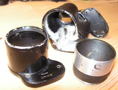 A rare specimen of the 8x40 model by Ernemann Werke Dresden. It must date from the 20s of the 20th centurym because the production period for Ernemann binoculars was only from 1913 to 1925. The top cover plate is inscribed with the firm's logo and "Ernemann-Werke AG Dresden". The bottom cover plate is marked "8x40", below serial number 987838. Moreover, someone scratched the word "Flegel" (= lout, rascal) on the cover plate near the objective tube. The monocular is made of aluminium with a black lacquering and a crinkle paint covering at the housing. It ahs a Bakelite eyecup and a dioptre scale running around the right-hand sided ocular marked at +5, 0 and -5. A special feature is that the bottom cover plate and the ocular tube is made from one piece of tin. After usncrewing the plate and tube, there is a aluminium objective frame with its 40mm lens. The upper prism is sloped at one of the longer sides, so that it fits into the prism chair. |