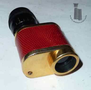 | Dieses 6x15 Porro-1-Monokular hat eine blaue Vergütung und ist daher ein Nachkriegserzeugnis von G. Fournier aus Paris. Die Aufmachung mit gold-polierten Deckeln (einfach verschraubt) und einer roten Lederummantelung deutet auf eine Verwendung als Opernglas hin. Es hat eine Kunststoffaugenmuschel und ein Okular mit einem unbeschrifteten Dioptrienausgleich. | This 6x15 porro 1 moinocular has blue coated optics. So, it must date from a post-war production by Fournier in Paris. The design with golden blank cover plates (one screw) and a red leather covering hints to a intended use as a opera glass. It has a plastic eyecup, and an eyepiece with a dioptre division without any numbers. |