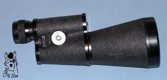 | Das Ginza 25x60 Monokular stammt aus japanischer Fertigung, was sich aus der unteren Deckelbeschriftung und dem Aufkleber des "Japan Telescope Inspection Institute" (mit Nr. 101) ergibt.Aufgrund der vergüteten Optik stammt es aus der Nachkriegszeit, schätzungsweise 70er Jahre. Das Glas hat einen Lederköcher und zwei Plastikschutzkappen. Zur stabilen Haltung des großen und 577g schweren Glases gibt es ein Stativgewinde. Es bietet ein Sehfeld von 2,5° (s. oberere Deckel). |