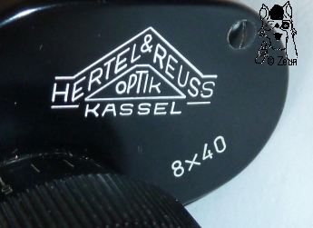 | Das blau vergütete 8x40 von Hertel & Reuss ist schwarz lackiert, hat eine Vulkanitummantelung, einfach verschraubte Deckel sowie einen langen, konischen Objektivtubus. Das Okular hat eine Kunststoffaugenmuschel und einen komplett umlaufende Dioptrienausgleich mit Kennzeichnungen bei +/- 5. Der obere Deckel ist außer mit dem Firmennamen und -logo mit "8x40" schräg zum Logo postitinoniert gekennzeichnet. | The blue coated 8x40 by Hertel & Reuss is painted black, has an ebonite covering, covers with only one screw, and a long conical objective tube. The eyepiece has a plastic eyecup and a full dioptre scale with markings at +/- 5. Besides the company's name and logo, the top cover is marked with 8x40 postitioned diagonally to the logo. |