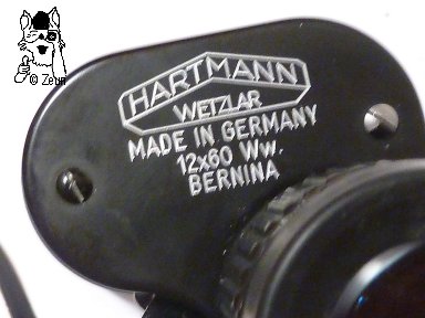| Das "Bernina 12x60" ist ein weiteres großes Hartmann Porro-1-monokular mit einer bläulich-magenta Vergütung und Weitwinkelokular, mit einem Kunstleder ummantelten Gehäuse, zweifach verschraubten Deckeln, eingegossenere Trageriemnöse und einer flachen (Brillenträger-)Augenmuschel. Das rechtsseitiges Okular hat Dioptirenskala mit drei Strichen für Plus und Minus. Der obere Deckel ist mit "Hartmann Wetzlar" im Prismenlogo und darunter mit "Made in Germany 12x60 Ww BERNINA" beschriftet. | The "Bernina 12x60" is a further large porro 1 Hartmann monocular with a magenta blue coating and with a wide angle ocular. The housing has a fake leather covering, a strap lug, and covers with two screws. The right-hand sided ocular has a flat rubber eyecup (for spectacle wearers) as well as a dioptre scale marked with three lines for plus and minus. The top cover is marked "Hartmann Wetzlar" in the prism logo and below "Made in Germany 12x60 Ww BERNINA" (Weitwinkel = wide angle). |
