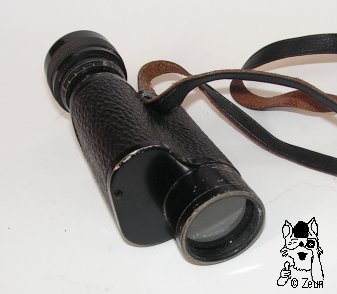 | Ein 6x30 Monokular in typischer Porro-1-Bauweise der Berliner Firma Harwix mit Modellnamen "Mirakel". Das Gehäuse ist aus Aluminium so wie die Deckel. Letztere sind schwarz lackiert und einfach verschraubt. Der obere Deckel ist nur mit "Mirakel 6x30" markiert. Das Gehäuse ist mit einem Rauhlack ummantelt. Die 2/3 Augenmuschel ist aus Plastik. Der Objektivtubus ist leicht konisch. | Here is a 6x30 monocular in its typical porro 1 design, mad by Harwix in Berlin model name "Mirakel". The housing is made of aluminium, just like the cover plates. The latter are painte black and have one screw. The top plate is marked "Mirakel 6x30". The body is covered with some crinkle paint. The 2/3 eyecup is made of plastic. The objective tube is slightly conical. |