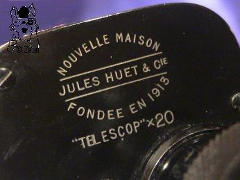 Das Monokular mit der Bezeichnung "Telescop"x20 stammt von der französischen Firam "Jules Huet & Cie" in Paris. Der obere Deckel ist außerdem mit "Nouvelle maison" (neues Haus) und "fondée en 1913" (1913 gegründet) beschriftet. Das Glas wurde von dem Optiker "Santi" aus der 3 Rue St. Fereol in Marseilles inklusive eines Köchers mit Trageriemen vertrieben (s. unterer Gehäusedeckel und Innenseite des Köcherfuterals).