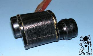 | Die Metallteile dieses 6x24 Monokulars wurden offensichtlich nachträglich noch einmal dick schwarz lackiert, so dass die Deckelbeschriftung oben auch schwer entzifferbar ist. Die Kennzeichnung sind "Huet Paris" im Prismenlogo, darunter "MG" (Ministre de Guerre = Kriegsministerium) und eine Zahl "...7939", evtl vor dieser weiter ziffern und/oder "No". Das Glas wurde also für das Militär verwendet (MG) und möglicherweise deswegen extra lackiert, zumindestens verhindert der Lack auch das freie Drehen des Okulars, so dass ein Fixfokus-Glas entstanden ist. Eine Diotprienskala ist nicht mehr erkennbar. Die Objektivlinse ist mit exentrischen Justierungsringen gefasst (s. Foto der Teile). Die genannten Fakten zur Beschriftung ohne Werteangabe, Übermalung und Fixfokus sowie Exenerringe könnten auch ien Hinweis darauf sein, dass dies ein nachträglich erzeugtes Monokular aus einem Binokular ist. Abgesägte Brückenstümpfe sind allerdings nicht zus ehen. Die Ummantelung mit einem Rauhlack oder Kusntleder ist intakt. |
