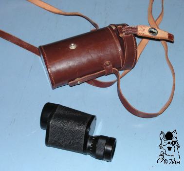 Die Typenbezeichnugn für das 6x30 Monokular von Leitz ist "Mondox". Das vorliegende Nachkriegs-Modell mit Vergütung hat die Seriennummer 512294. Die schwarz lackierten Deckel sind zweifach verschraubt. Das Gehäuse hat eine Rauhlack- oder Kunststoffummantelung und eine Trageriemenöse. Das linksseitige okular hat eine umlaufende Dioptriensakla mit Kennzeichnungen bei +/-5 und Null. Auf der Plastikaugenmuschel steckt bei dieses Exemplar ein Okular-Filter (Polarisationsfilter?). The model name for this 6x30 monocular by Leitz is "Mondox". The post-war model here has coated optics and serial number 512294. The black lacquered cover plates have two screws. The housing has a black crinkel paint or plastic covering and a strap lug. The left-hand sided ocualr has a dioptre scale running completely around the ocular and being marked at +5, zero and -5. A filter glass (polarisatiuon filter) is slipped onto the eyecup.