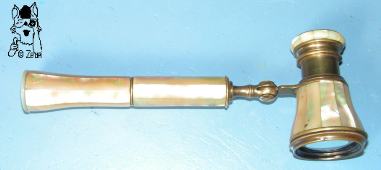 Lemaire Spy-Glass with HandleHere is a perspective or monocular spy-glass made of brass with one draw and a mother-of-pearl covering fot the main tube and the eyecup. The eyecup is inscribed "Lemaire Fabi Paris" and also marked with the bee emblems of Lemaire. There is a attachment ring with a set screw and a handle at the main tube. The handle is also covered with mother-of-pearl.Optical specifications are 4 times magnification, and a 28mm objective lens. The handle is 14cm in length, having a diameter of 15mm at its top and 23mm at the end. The connecting brass part near the screw is 5.6mm in diameter. The spy-glass's overall length is 50mm closed and 60mm extended. The eyecup has a 28mm diameter, the draw tube 19.2mm, and the objective tube is 27mm at its top and 38mm at its bottom. The Galilean glass weighs 154g. It dates from the 19. century. |