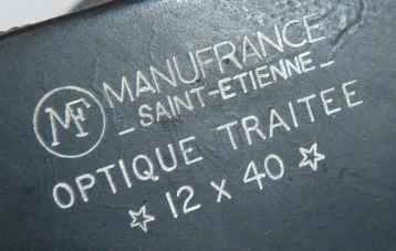 This 12x40 monocular was made by "Manufrance" in Saint Etienne, France. The top cover is also marked "optique traitée", meaning coated optics, and a star with five rays. The eyecup is made of plastic. The dioptre division run around the left-hand sided ocular and the lines are marked from 1 to 5. The prism housing and the short objective tube have are covered with synthetic leather; the metal parts are lacquered black.
