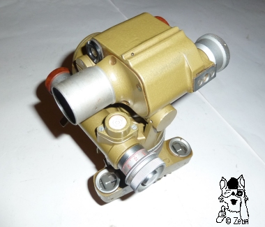 | Der PAB-2 Richtkreis (PAB = "Periskopische Artillerie-Bussole") wurde seit den 1960er Jahren in den Ostblockstaaten beim Militär eingesetzt; er wird heutzutage noch von ZRAK (Sarjewo) gebaut. Er arbeitet mit einem 6x22 Visierfernrohr mit Porro 1 Prismen. Der seitliche Träger ist mit "PAB-2M" beschriftet. Die Optik ist blau-magenta vergütet. Das Alu-Okular hat einen Dioptrieneinstellung ohne Beschriftungen und eine Strichplatte, die bleuchtet werden kann. Oben am Gehäuse befindet sich ein einfaches Visier (Rille mit Stift). Die Metallteile sind olivgrün lackiert, das Objektiv, der Strichskalenring und einige Knöpfe sind unlackiert aus blankem Aluminium. Zwei Knopfabdeckungen und der kugelförmige Stativsockel sind aus rot-braunem Hartkunststoff. | The PAB-2 aiming circle (PAB = "Periscopic Artilly Boussole") was made since the 1960s for militar use within the Eastern Bloc states. It is still made by ZRAK in Sarajewo. It works with a 6x22 sight with porro 1 prisms. THe mount is marked "PAB-2M". The optics are coated blue and magenta. The aluminium eyepiece has a diopte adjustment, but woth no scale. It also comes with a reticle which can be illuminated. On top of the hosuing is a simple bead and sight (a groove and a pin). The metal parts are lacquered olive-green, the objective tube and the aiming circle ring and some knobs are unpaitned, made of aluminium. Two covers for the wheel knobs and the tripod ball base are made of brownish-red plastic. |