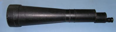 The 41-48mm long and 27mm wide eyepiece has a Bakelite eyecup with a 34mm diamter. The dioptre is marked with lines all around and numbers at 0, -5 and +5. The 67mm tall and 67mm wide round orism housing was made of brass with black lacquered cover plates anmd a black fake leather covering. Due to its porro 1 prism system it is attached offset to the main straight tube, also made of brass and covered with black fake leather. A 28mm lomg uncovered tube ring might be the original part for attaching the tripod. The conical objective tube starts with a diameter of 82mm and end with 122mm. The final part is a 73mm long objective frame being 144m min diameter, and made of black painted aluminium. The ojective tube is also made of aluminium – inside painted with a matte black nad outside also covered with fake leather. The achromatic objective lens 126mm in diameter and about 30mm thick. It is held by some red rubber rings within the objective frame. |