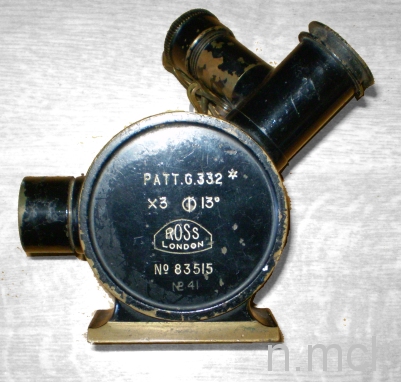 This military fix focus sight with a 45° angled view was made in Great Britain in WWII. by Ross Ltd. and some other makers. It has Admirality Pattern G332(M). The pictures show models with Ross logos from different company periods so that it may have been produced after WWII. The specimen I have is inscribed with "Patt. G322M" and its specifications "x3" as well as f.o.v. "13°" - in between a small circle - and below "75/PPE/104143". PPE is the abbreviation for Pilkington Perkin-Elmer (cf. Avimo 7x42), a company which assumingly only overhauled the sight in 1975. It is coated blue. Another known specimen is marked "A.K.&S." (A. Kershaw & Sons) (see photo). The monocular has a dove-tail mount at its bottom and desiccation outlets at its top and bottom (red screw) of its round body. The objective comes with a fixed rain guard tube, and the eyepiece has a soft rubber eyecup. The sight has a built-in cross-hair reticle. The scope was used on AA guns. So, another model has a more complex grid reticle and an illumination unit. |