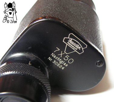 | Dieses 7x50 Porro-1-Monokular stammt vom Nürnberger Optikvertreiber "Seeadler" und ist am Deckel mit deren Logo und "Seeadler Nürnberg-16 7x50 Nachtglas Nr. 30524" beschriftet. Der untere Deckel ist mit einem Emblem "S in einer Raute" gekennzeichnet, wahrscheinlich das Herstelleremblem und ggf. aus japanischer Fertigung. Das mit strukturiertem Hartgummi überzogene Gehäuse hat eine Trageriemenöse und ein Stativgewinde. Die Deckel sind einfach verschraubt und schwarz lackiert. Das linksseitige Okular hat eine Kunststoffaugenmuschel und eine Dioptrienskala von +2 bis -4 mit Teilstrichen zwischen 0, 2 ,3 und 4. | This 7x50 porro 1 monocular was distributed by "Seeadler Nuremberg" (= sea eagle). It is inscribed with their log and "Seeadler Nürnberg-16 7x50 Nachtglas Nr. 30524" at the top cover. The bottom cover plate is marked with a "S" in a diamond emblem, probably the maker'S emblem – and htis probably some Japanes maker. Ther housing covered with textured hard rubber has a strap lug and a tripod thread. The cover plates have one scew and are painted black. The left-hand sided ocular has a plastic eyecup and a dioptre scale from +2 to -4, having division lines between 0, 2 , 3 and 4. |