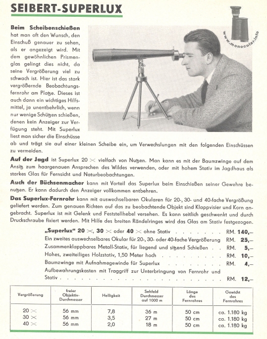 | Das 1210g schwere Spektiv Modell "Superlux" hat ein Porro-II-Prismen-System in dem dafür typischen dosenförmigen Gehäuse (Durchmesser 58mm, 26mm hoch). Das Gehäuse ist neben dem Modellnamen und dem Firmenlogo sowie der "No 36991" (40x Modell) bzw."No 35943" (30x Modell) beschriftet. Das 24mm breite Okular hat eine Kunststoffaugenmuschel und lässt sich zum Fokussieren drehen, eine Dioptrienskala ist jedoch nicht vorhanden. Der 43cm lange Objektivtubus verbreitert sich von 33mm am Gehäuse auf 66mm am Objektivende. Die Objektivlinse ist 56mm im Durchmesser. Im Tubus befindet sich eine Gesichtsfeldblende in der Nähe des Objektivs. Am Tubus aufgeschraubt sind eine Visiereinrichtung, welche sich am Gehäuseübergang wegklappen lässt, und eine Stativhalterung mit Feststellhebel und Arretierschraube. Alle Teile sind schwarz lackiert. | This "Superlux" model weighing 1210g has a porro II prism system, which is contained in the can-shaped housing typoical for that (diameter 58mm, 26mm tall). The housing is marked "No 36991" (40x model) or "No 35943" (30x model) besides the company's logo and the model name. The 24mm ocular has a plastic eye-cup and can be turned for focussing, but there is no dioptre scale. The objective tube being 43cm long widenes from 33mm at the housing to 66mm at the objective end. The objective lens has a diameter of 56mm. There is a diaphragm inside the tube near the objective. It also has notch and bead sights, of which the one near the housing can be flipped down. The screwed-on tripod mount has a adjustment lever and screw. All parts are lacquered in black. |