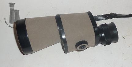 The 7x50 monopcular marked with the trademark and model name "Select Night Vision" is a classical Porro 1 prism design made in Japan. It may cureently be available in Japan (date: 2018), but not intended for the world market. That it is a current model is reflected by stating it is a "Bak4 prism" glass. Besides this, the top cover is inscribed with "Field 6°" on its slightly bended top cover. The control sticker of the Japan Telescope Inspection Institute is written only with Japanese signs, thus hinting at a domestic market article. The lower cover is marked with a logo and number "305F 6966". The eyecip is made of foldable soft rubber, the focusing part and the dioptre ring are made of plastic. The dioptre scale ranges from + to - 3. The objective tube and frame are also made of plastic. The aluminium cover plates are painted black and are fixed with one screw. The body is covered with a bright suede. It has a strap-kug as well as a tripod adapter. The optics are coated blue. The denotation "NightVision" was probably chosen to hint at the rather wide aperture allowing a higher brightness. |