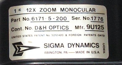 | Die Gehäuseunterseite trägt einen Beschriftungsaufkleber, der folgende Angaben macht: "1.5-12x Zoom Monocular - Part NO: 6171-5-200 Ser.No: 1779 - Cont.No. D&H OPTICS Mfr. 9U125 - UNITED STATES PATENTS No. 3212420 & FOREIGN PATENTS GNTD", darunter ein Firmenlogo und "SIGMA DYNAMICS CORP. ABINGTON, PA -- MADE IN U.S.A.". Die 1965er Patentnummer bezieht sich auf eine Bildstabilisierung ("image motion compensator"), welche für mich beim Durchschauen nicht ersichtlich ist - evtl. nur die Bewegungen beim Zoomen ausgleicht. | There is a label at the bottom of the housing running: "1.5-12x Zoom Monocular - Part NO: 6171-5-200 Ser.No: 1779 - Cont.No. D&H OPTICS Mfr. 9U125 - UNITED STATES PATENTS No. 3212420 & FOREIGN PATENTS GNTD", and below the firm'S logo as well as "SIGMA DYNAMICS CORP. ABINGTON, PA -- MADE IN U.S.A.". The 1965 patent number refers to am "image motion compensator" which i cannot realize when looking through, but might compensate for the shaking during zooming motion. |