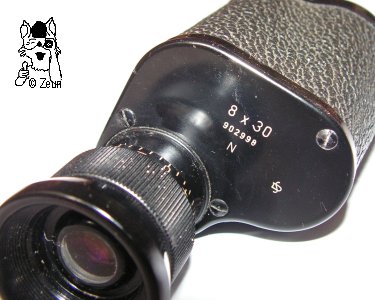 These 8x30 Swarovski monoculars have a magenta coating. Their housings are covered with textured hard rubber. The cover plates have three screws and are painted black. There is a plastic eyecup at the left-hand sided ocular. The top cover plate is marked with the interwoven initials "DS" for Daniel Swarovski as well as "8x30 902998 N" or >"8x30 915948" (no N). The dioptre scale has division lines from plus to minus ten, yet only marked at zero +5 and -5. The second version has a full dioptre scale on a wide dioptre ring. Also, the eyecup has straight sides, whereas the first model has a cone shaped eyecup. The second model is also marked "Habicht" in handscirpt letters on the bottom cover. The glass measures 105-113mm. The housing is 50x50mm at its top and 56x56mm at its bottom. The objective frame is 41mm in diameter. The eyepiece diameters are different for the two monoculars: ocular tube 24mm and 27mm; focusing part 30mm and 34mm; eyecup 34mm and 33mm in diameter. So, the second model comes with a wide angle eyepiece - its field of view is wider than with the 1st model. The monoculars weigh 206g. |