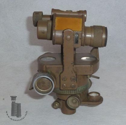 The 26mm ocular piece originally had an eyecup, because there is a thread for it. The eyepice has a dioptre adjustment with a +/-5 scale. The sight comes with a reticle that has sveral division markings for targeting and measuring distances (s. photo). The reticle can be lightened through a tiny window on top of the sight. The 16mm objective lense is held in a 25mm frame. The body is triangular with rounded edges. The sides measure 40x40x48mm. There is a plastic area on one of the top sides. Its function is not clear to me. Other aiming circle sights had such a bottom area which was phosphorescent to illuminated the compass. At the top right-hand side of the monocular is a small bubble lever to adjust the sight. The bubble lever's glass can be sheltered with a cover that swings over it. You can adjust the declination with a turning knob on the objective side. There is a +/-5 scale on the side of the mounting arm. |