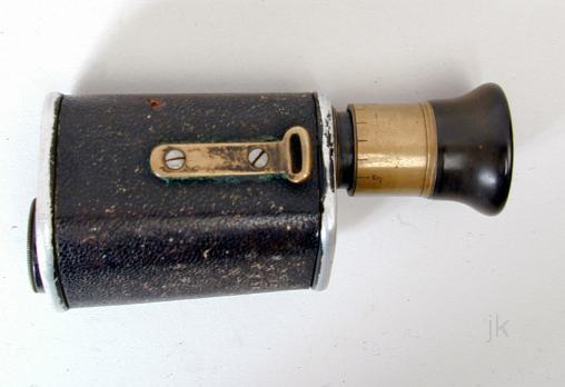 | Es ist teils aus Aluminium, teils aus Messing hergestellt. Das Gehäuse ist lederummantelt und hat eine angeschraubte Trageöse beim zweiten Modell. Die Augenmuschel ist aus Bakelit mit einem Durchmesser von 32mm. Das Okularstück ist 18mm im Durchmesser. Das Glas wiegt ca. 165g und ist 106-113mm lang. Das Gehäuse missst oben und unten ca. 45x45mm. Der Objektivring ist 24mm im Durchmesser mit einer 20mm Linse. | It is partly made of aluminium and brass. The housing is covered with leather and the second model has a screwed on brass strap with lug. The eyecup is made of Bakelite, having a 32mm diameter. The eyepiece is 18mm in diameter. The glass weighs c. 165g and is 106-113mm in length. The housing measures 45x45 mm at its top and bottom. The objective ring is 24 mm in diameter. The objective lens itself is 20mm |