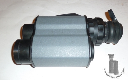 The monocular has coated optics, a 54mm objective lens with 50mm aperture and an eyepiece with a focusing ring, zoom ring and dioptre adjustment. The eyecup is made of soft rubber which can be squeezed like a bellows. There is a rubber cap for the eyepiece attached to a strap. The eyepiece and objective side are made of black painted metal frames between which a grey plastic housing is held. A hand strap is screwed to the frame pieces. Additionally, a carrying strap can be attached.